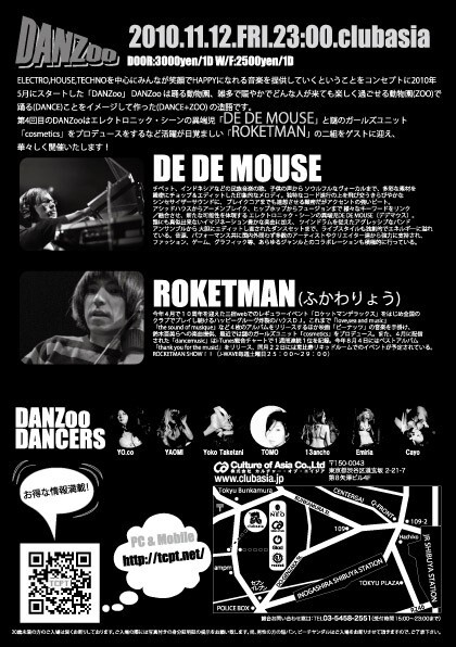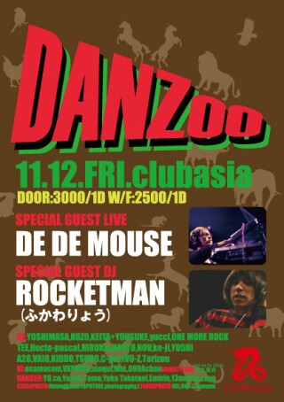 第4回目のDANZooは強烈なライブ・パフォーマンスでアンダーグラウンド・クラブ・シーンを席巻し続けている「DE DE MOUSE」とシングル「dancemusic」が、iTunes総合チャートで1位を獲得するなど10周年を迎えて今ノリにのっている「ROCKETMAN」(ふかわりょう)の豪華お二方をゲストに迎え、華々しく開催いたします!