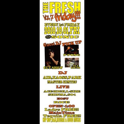 [THE FRESH] 『最高のパー ティーで神戸の平日を盛り上げたい!』という思いから集まったDJ達が厳選されたクラブミュージックをPLAYし、第2・4火曜日を盛り上げてきた[THE FRESH]が今年4月から「毎月第1金曜日」にリニューアルスタートしました!! 2010年に 入りさらなる盛り上がりを見せているTHE FRESH!皆さんで最高の夜を作りましょう!! 出演者一同、 皆様のご来場をお待ちしています!!
