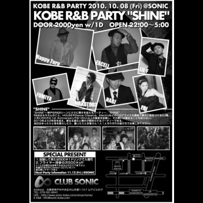 EVERY 2ND FRIDAY!! KOBE R&B PARTY "SHINE" @SONIC 2010. 10.8 (Fri.) DOOR 2000yen w/1D OPEN 22:00〜5:00