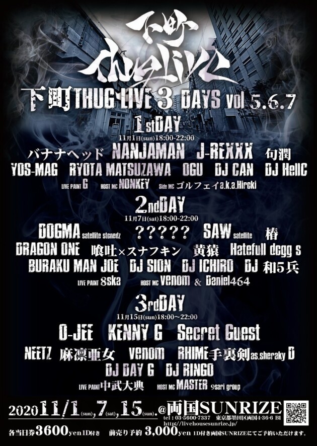 毎週末3日間に渡るHIPHOP LIVEイベント開催!! 開催場所は下町の両国SUNRIZEにて行います。 当日入場3,600yen 1D付き 前売り予約3,000yen 1D付き(両国SUNSIZEにて受付) 小学生以下無料(保護者同伴)